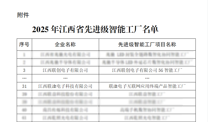 近日,江西省工业和信息化厅正式公布2025年江西省“先进级智能工厂”名单,186家企业入选。其中星空app官网登录入口,星空app(中国)、江西联淦电子科技有限公司2家联创电子系企业名列榜单。这标志着公司在智能制造领域的创新成果再次获得政府权威认可。