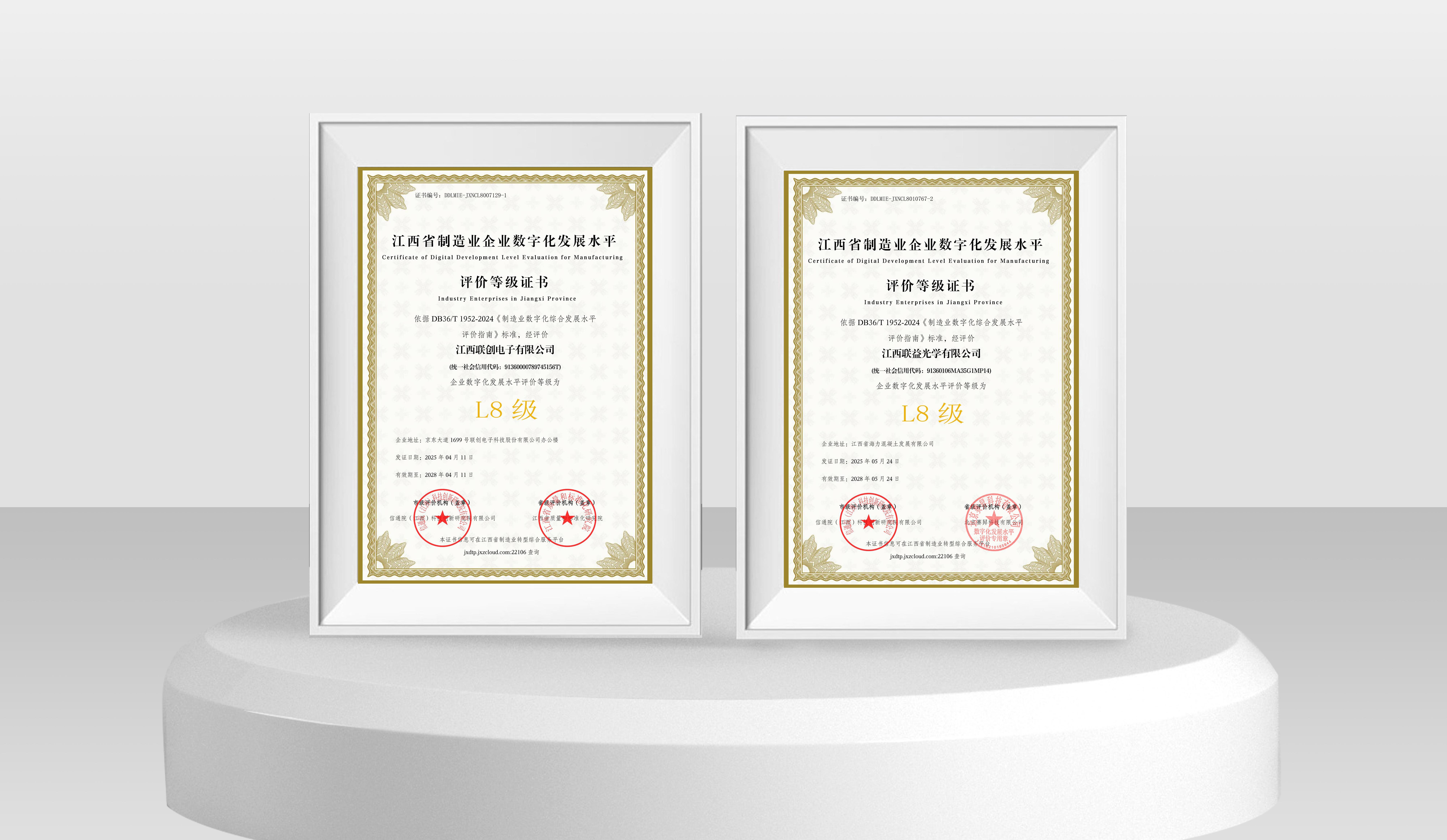 近日,联创电子科技股份有限公司旗下星空app官网登录入口,星空app(中国)(以下简称江西联创)与江西联益光学有限公司(以下简称江西联益)凭借深度集成与创新应用能力,在江西省制造业企业数字化发展水平等级评价中双双达到L8级水平,标志着两家企业在数字化转型领域已跻身全省“集成提升阶段”最高水平,为全省制造业智能化升级树立新标杆。